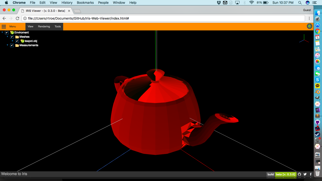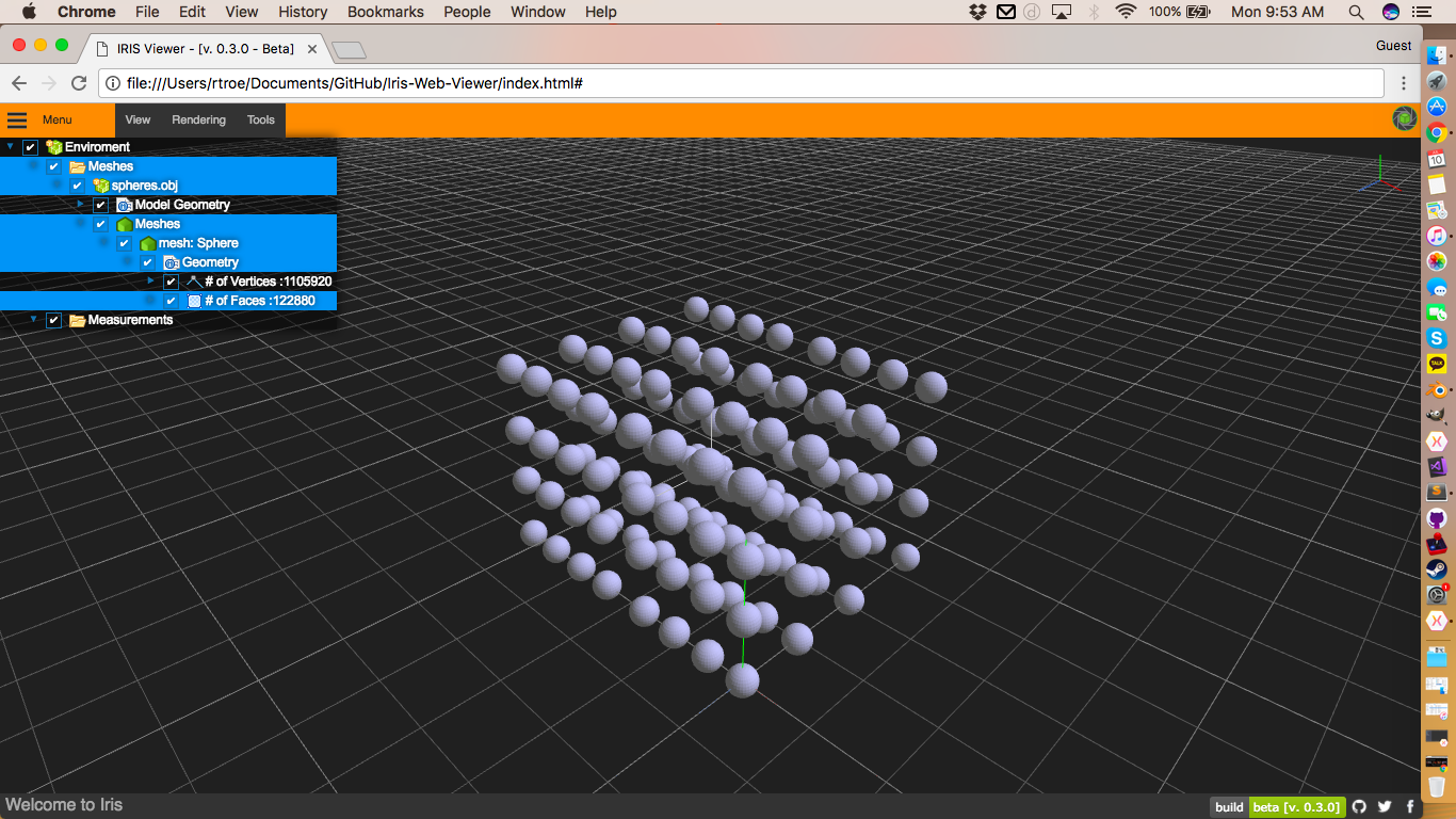 Every 3D application will have user interaction to some degree. But with the CPUs and GPUs these days, it’s easy to have 100’s or 1000’s of entities per scene, and if you want to do per-triangle selection, It’s very easy to quickly end up with 100 000s into the millions of triangles with in a scene. Take the Standford Dragon mesh as an example. Below is a version of it opened in Iris Viewer which holds 900 000 Vertices which make up 100 000 faces kept in a single mesh.